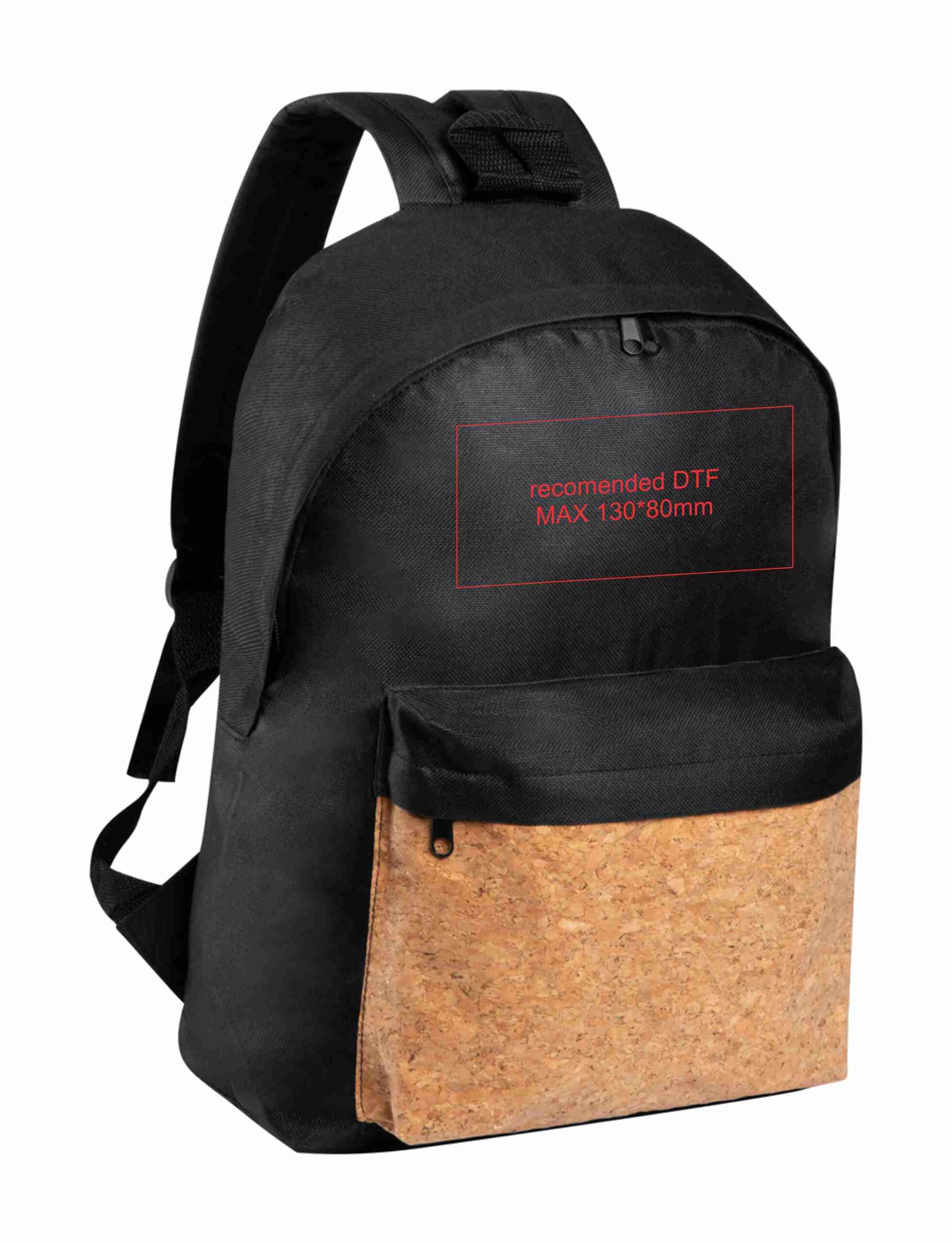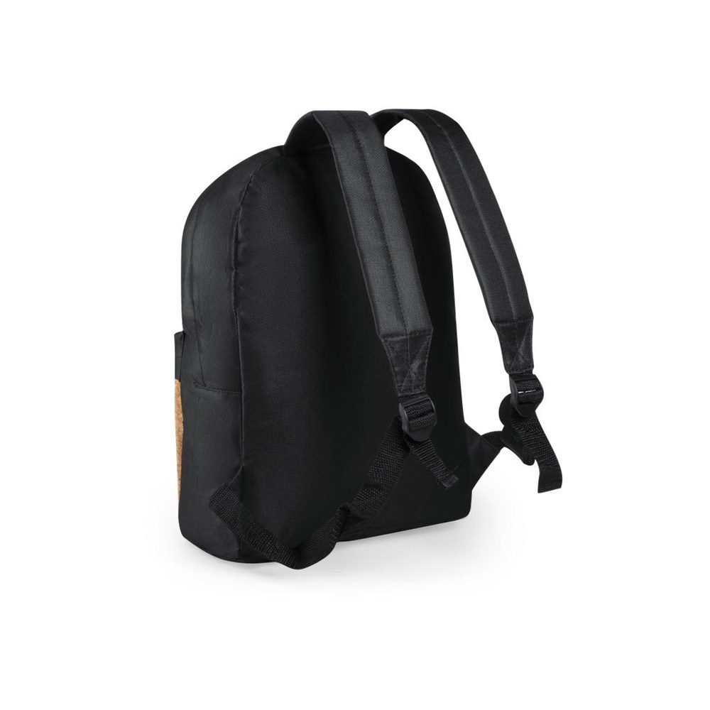 Ранец од отпорен 600D полиестер, предниот џеб од природна плута. Прилагодливи прерамки. Препорака за печат макс 130 х 80mm